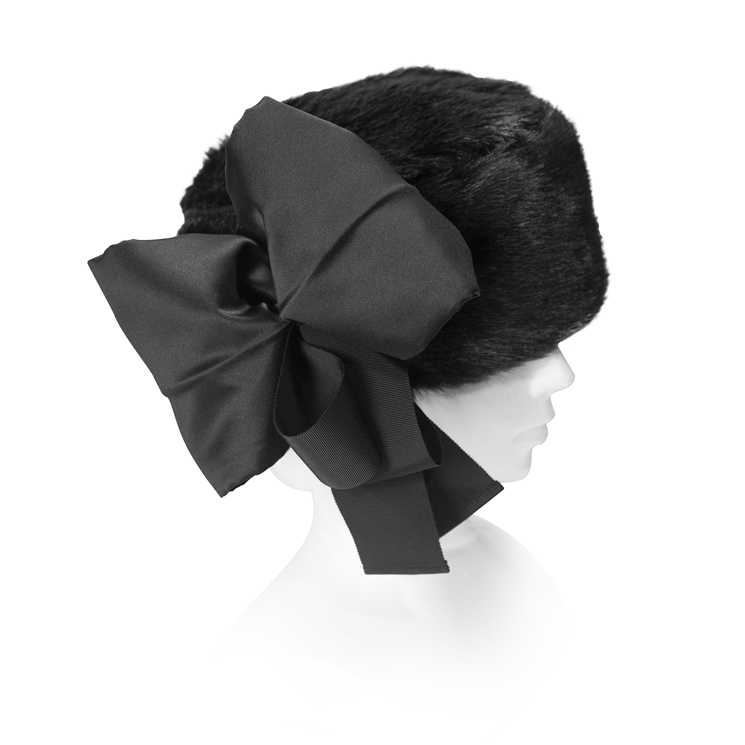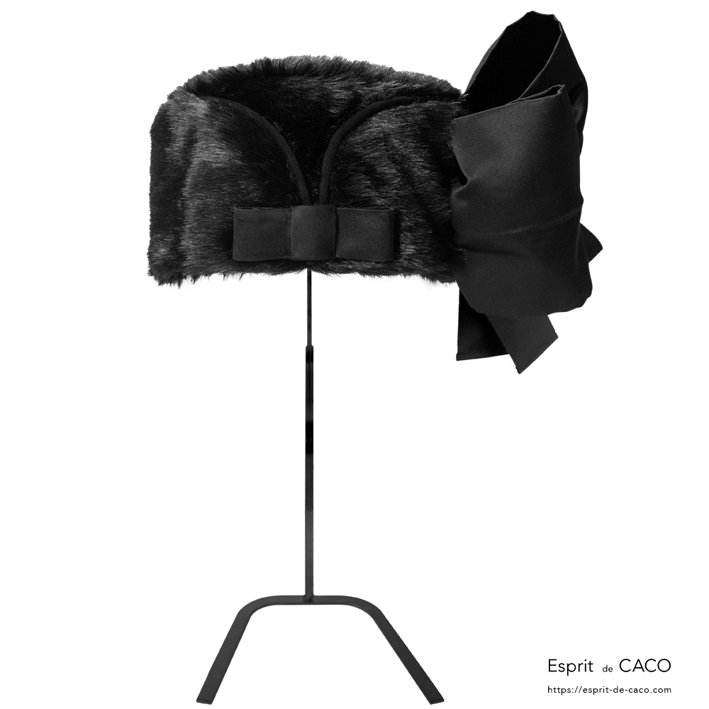 立体的なリボンを飾ったファーハットです。高級フェイクファーの艶感とマットサテンの上品な光沢がエレガントなお品です。前後どちらでもお召しいただけます。