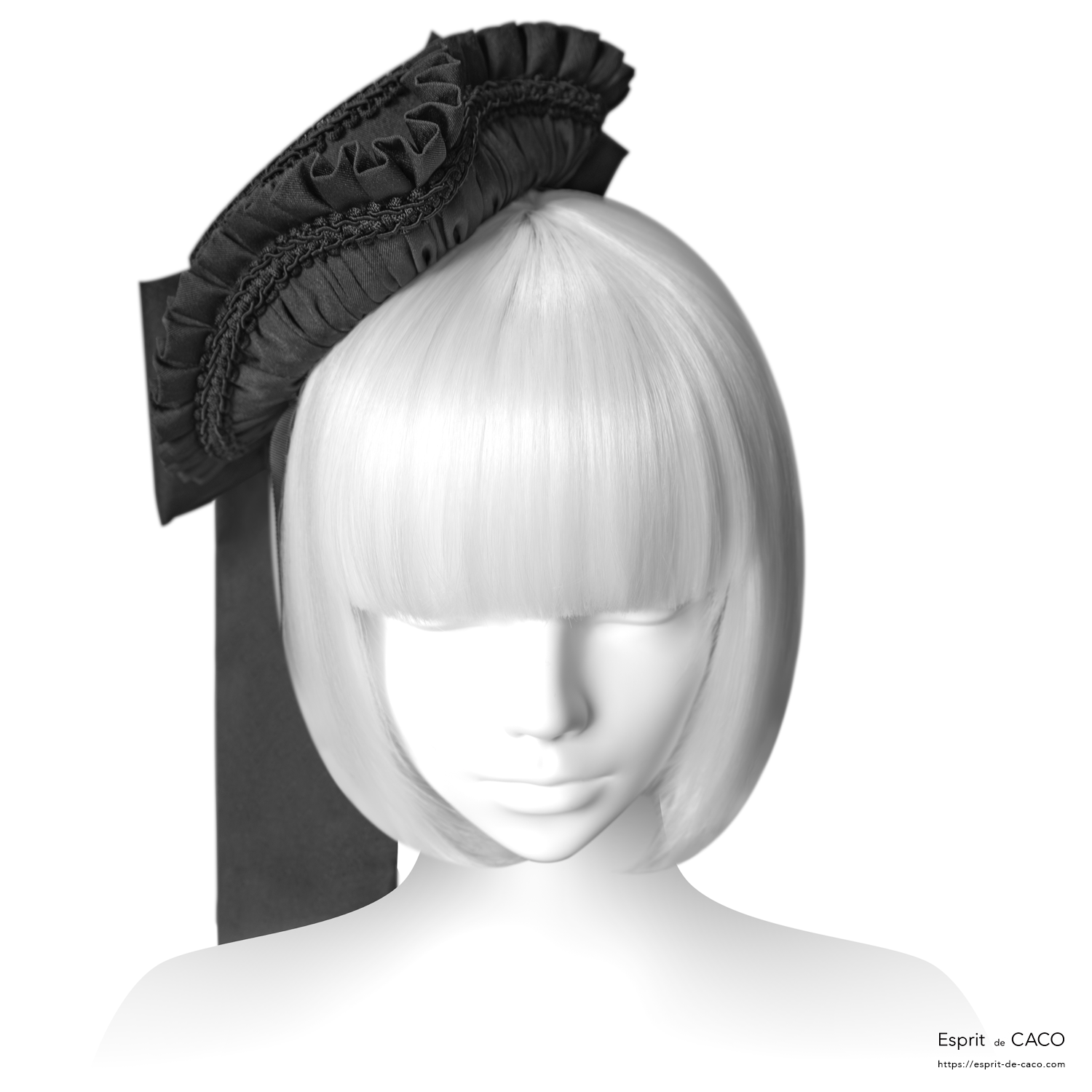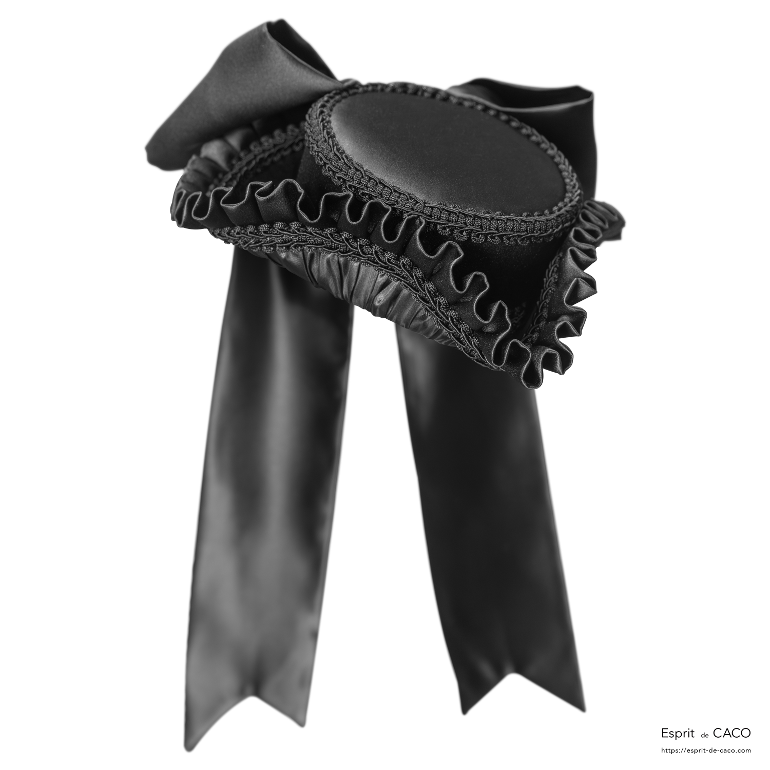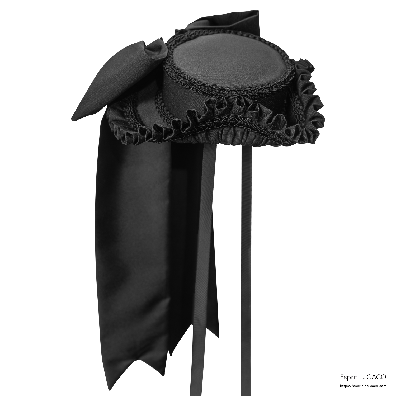 トリコーン型のドレスハットです。小さな女の子の船長という意味の名前で、好奇心あふれる冒険好きな女性像から着想した作品です。結びリボンは取外し可能です。
